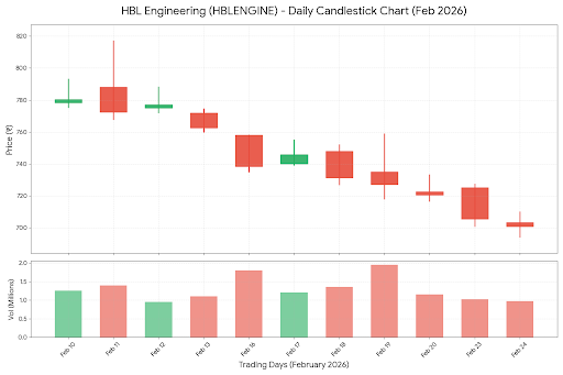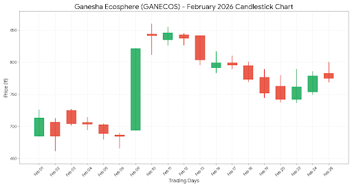 A mid-month dip occurred around Feb 16–20, with the stock declining from ~₹740 levels toward ~₹720, indicating supply pressure near higher resistance zones.