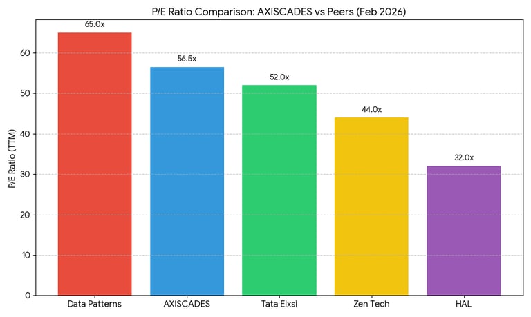 The chart highlights that AXISCADES is currently trading at a significant premium compared to traditional defense giants like HAL and even pure-play ER&D firms like Tata Elxsi.